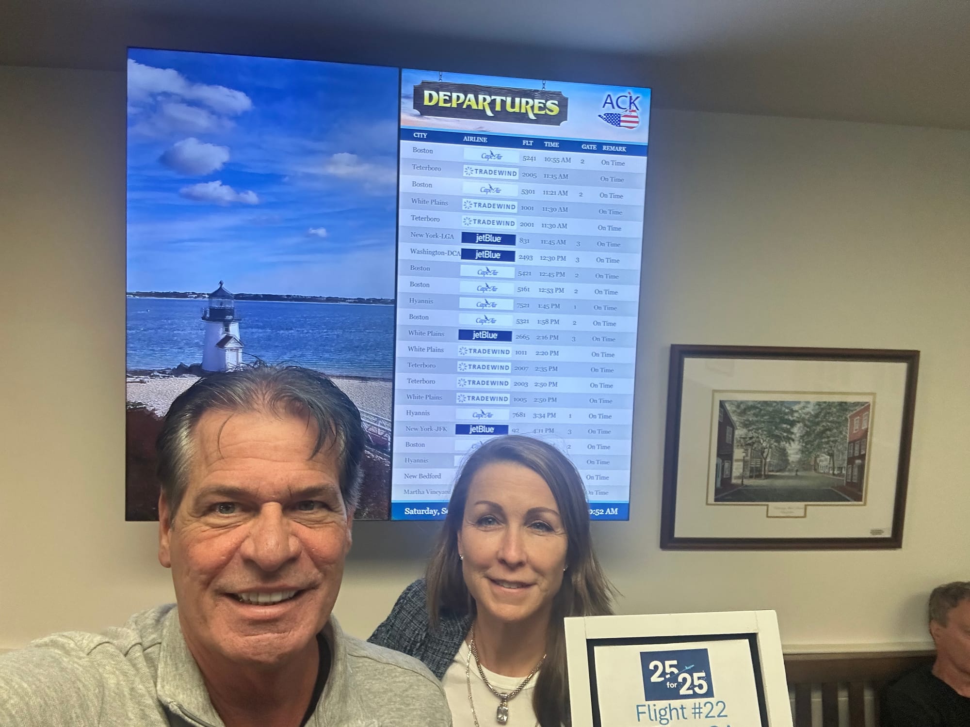 JFK to ACK (Nantucket): A short flight and our first ramp deplane instead of a jetbridge. Met some wonderful fellow challengers, including a retired West Chester police officer who introduced us to this community—thank you, Mel lsa! Meeting interesting 25 for 25ers continues to be one of the best parts of this challenge.