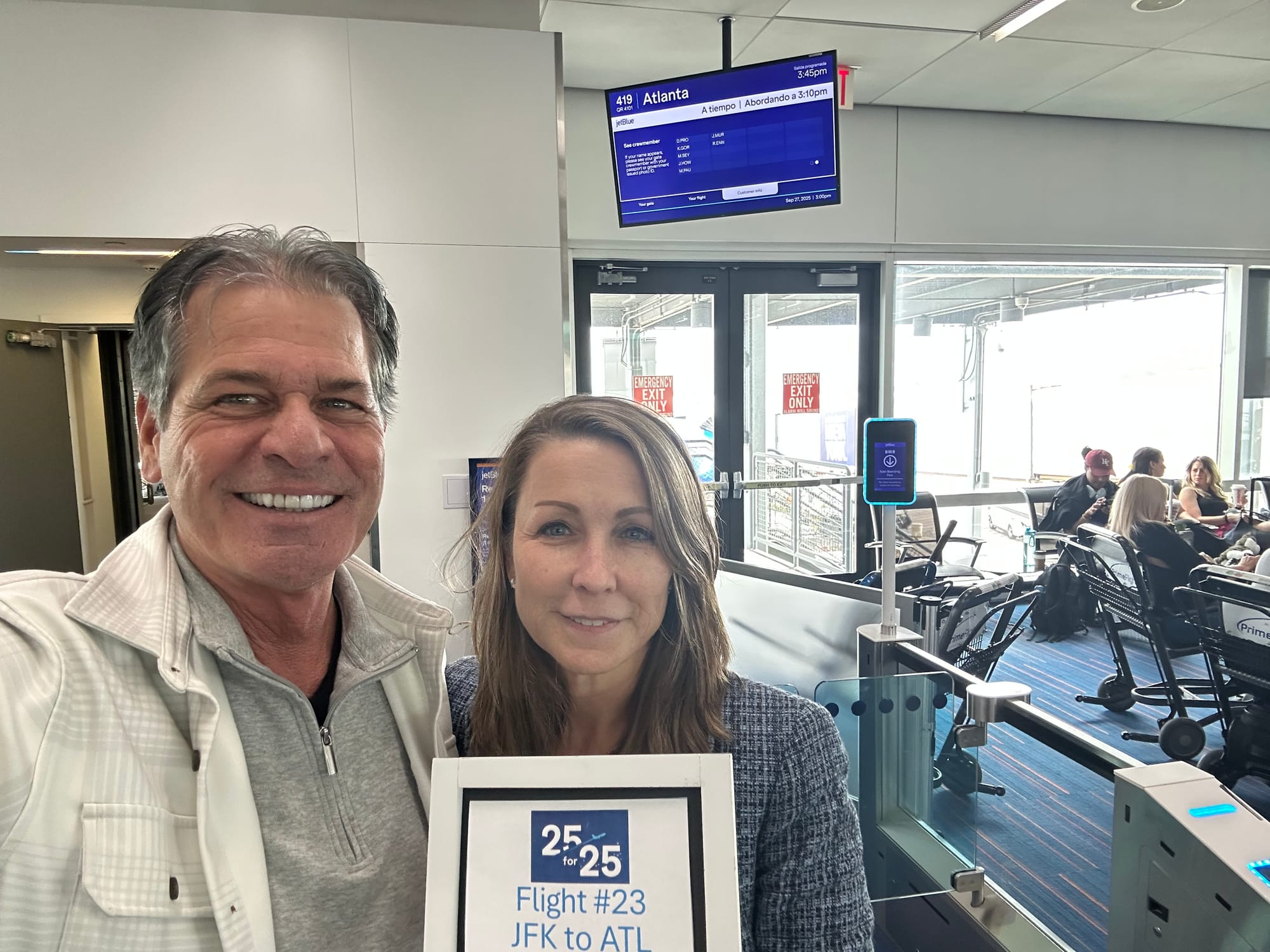 JFK to ATL (Atlanta): This gave us destination #24 (ignore our chalkboard count, as we thought it was only #23). Delayed 90 minutes when a passenger wanted to deplane after pushback, forcing air traffic to reassign our routing and requiring additional fuel. No problem for us, but I assume JetBlue wasn't happy.